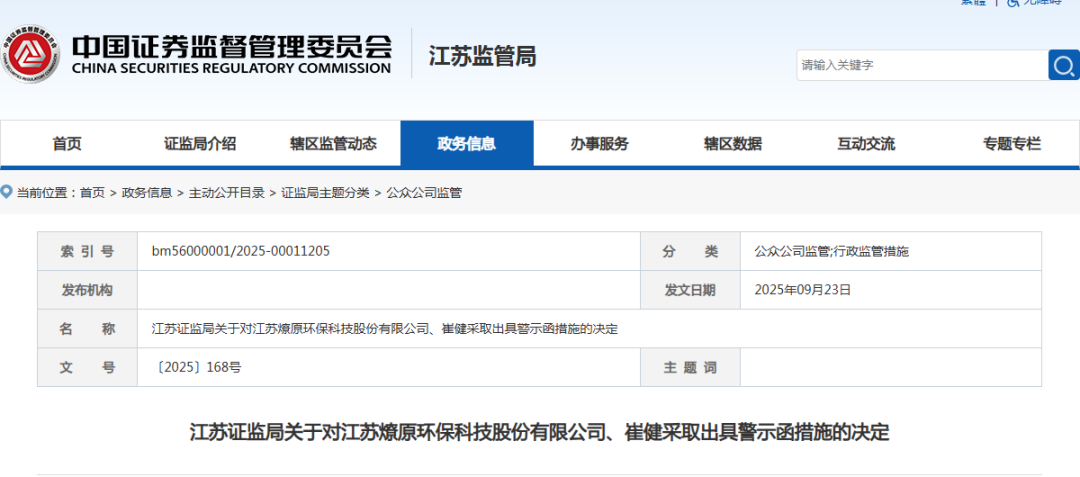9月25日,据江苏证监局官网,江苏燎原环保科技股份有限公司(下称“燎原环保”)在收购山西瑞赛科环保科技有限公司股权事项上存在问题,公司及董事长、总经理崔健被江苏证监局采取出具警示函的行政监管措施,并记入证券期货市场诚信档案。